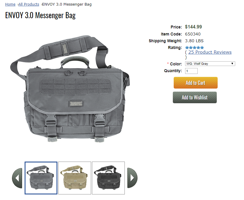 The specific bag color featured in this article is “Wolf Gray”. VanQuest offers the item in Black and Coyote Tan as well. For more in depth information, you can view the product by clicking the image below, or visit https://www.vanquest.com/products/envoy-3-0-messenger-bag