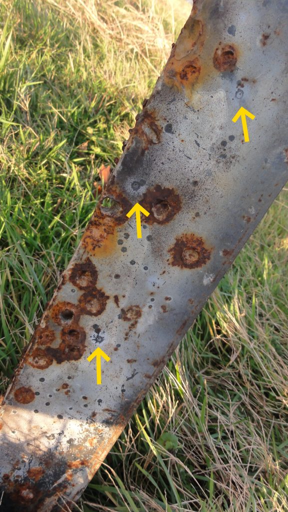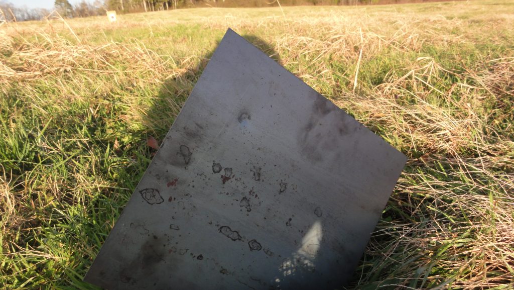 I put probably about 12 rounds onto the plate without getting it to ring. Frustrated I inspected the target and discovered that I was indeed making hits, the plate was just so heavy that the light bullet wasn’t able to make it ring anymore. The only thing the bullets really did was knock paint and dirt off. There was no cratering at all.