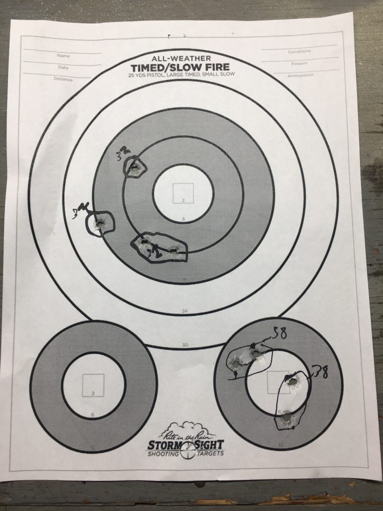 Just to get some quantifiable data here since I was shooting paper instead of steel, I decided to get a group with both guns. Since I only had 4 rounds remaining of 38 Special, I shot 4 rounds of 32 as well to make it even.