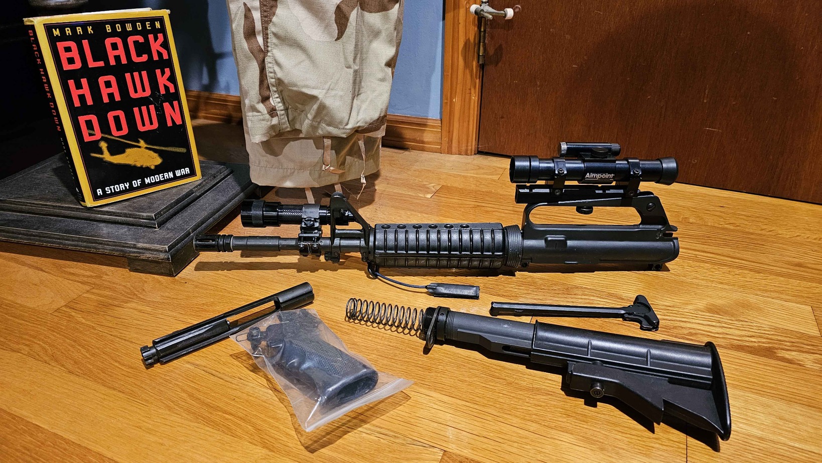 One of the most defining visuals of the 723 in Black Hawk Down is the pairing with the Aimpoint 3000 or 5000 optic mounted via a carry handle adapter. In the early 1990s this was cutting edge, a time when red dot sights were still relatively new and not yet standard issue. Operators like Gordon and Shughart famously carried these carbines, each customized slightly with accessories such as early SureFire weapon lights, tape switches, and two point nylon slings. These builds became the template for many modern clone projects, and their silhouette remains instantly recognizable to anyone familiar with special operations history.